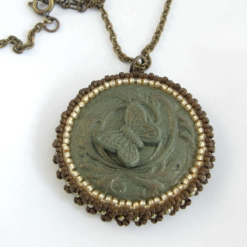 Fuzzy and off-colored pics of last year's Christmas presents (I didn't have time to shoot them before giving, so these are taken later with my phone). My Mom's necklace is made with polymer clay beads, lava stone beads and silver plated copper wire. The Fairy-sister's pendant features a polymer clay cabochon with a 3-d butterfly, bezelled with Japanese 15/0's.